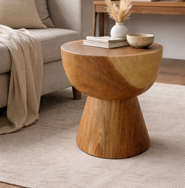 The Suar Wood Hourglass Side Table represents the perfect harmony between nature’s raw beauty and human artistry. Unlike traditional joined furniture, each hourglass table is carved from a single solid log of Suar wood. This “monoblock” construction highlights the continuous flow of the wood grain, creating a seamless and mesmerizing visual experience from top to bottom.