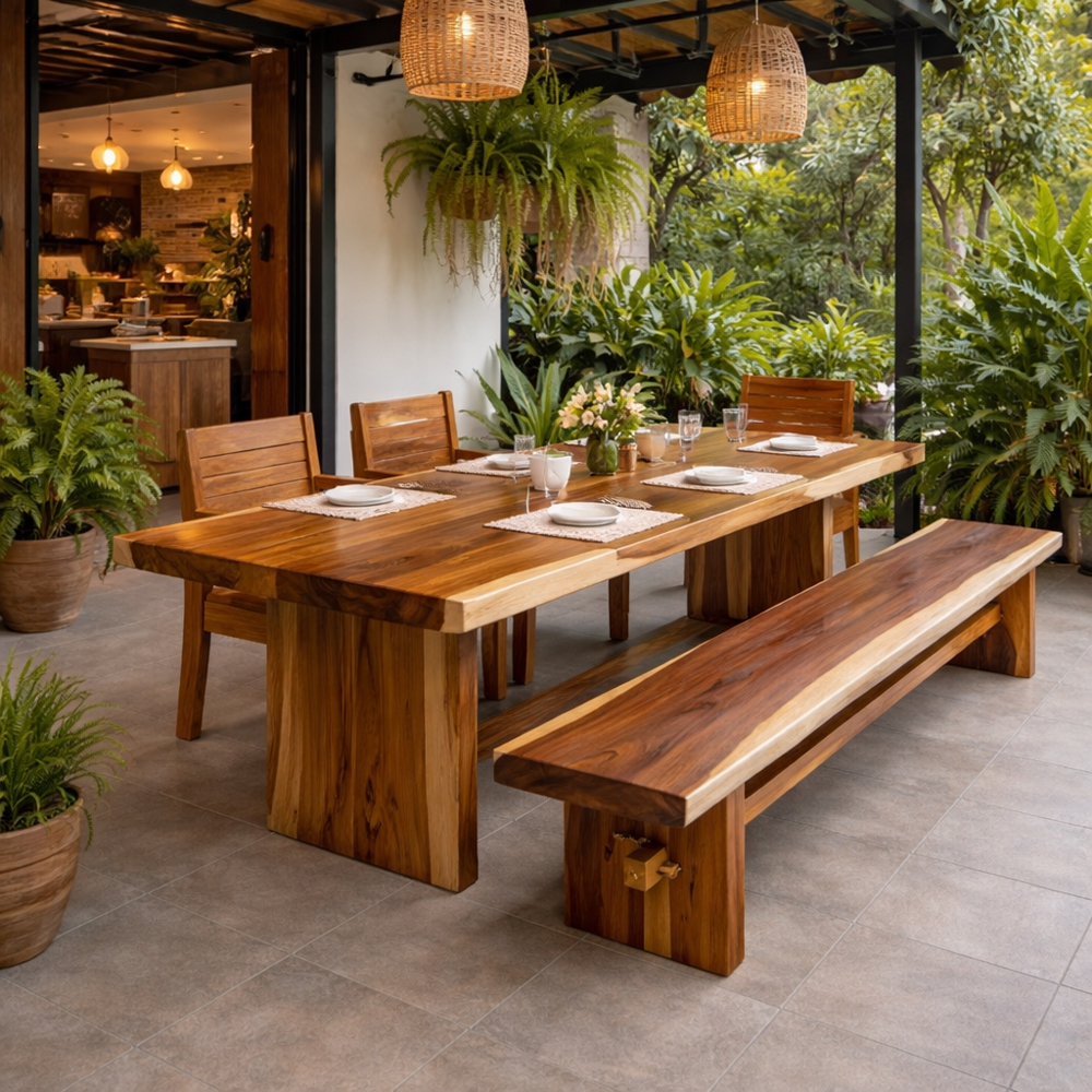 This bench is made from 100% solid suar wood (Albizia Saman), known for its exceptional durability, rich natural grain, and resistance to cracking. Each piece is carefully handcrafted by skilled artisans, preserving the authentic live edge design, making every bench one-of-a-kind with its own organic character.